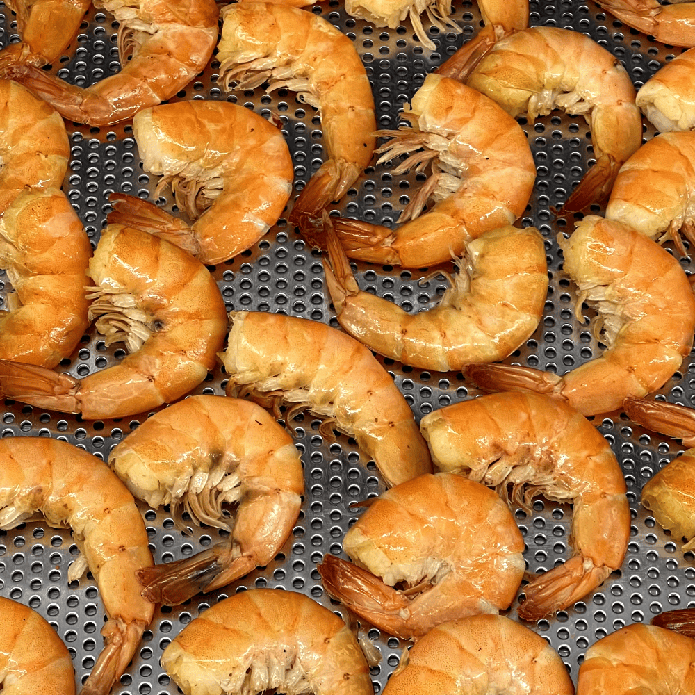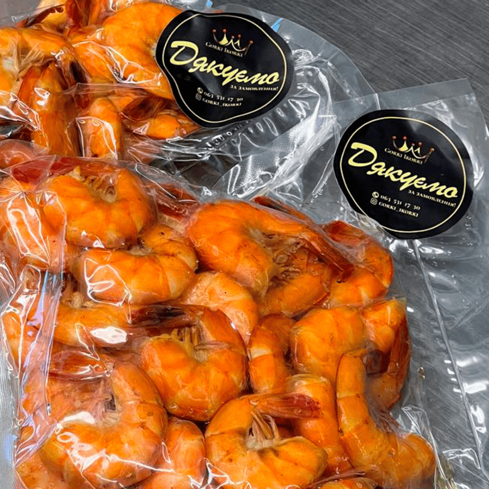 Креветки тигрові без голови приготовані за авторським рецептом методом холодного копчення на щепі, мають ніжний слабокопчений смак.
