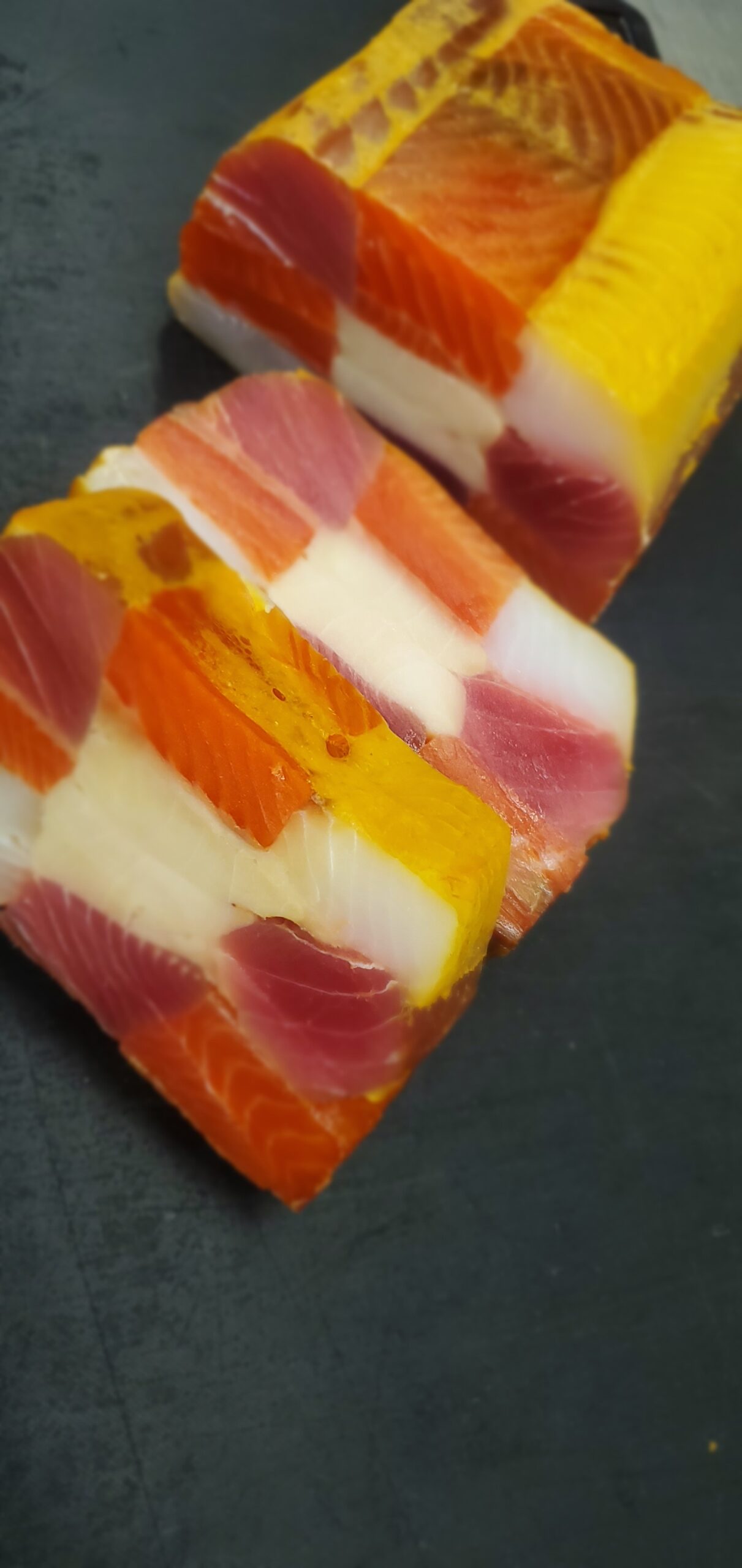 Рулет Нарди приготований методом холодного копчення на натуральній щепі з філе охолодженої норвезької форелі, філе масляної, балика тунця та філе охолодженого палтуса.Має чіткі шари риби та ніжний слабокопчений смак.